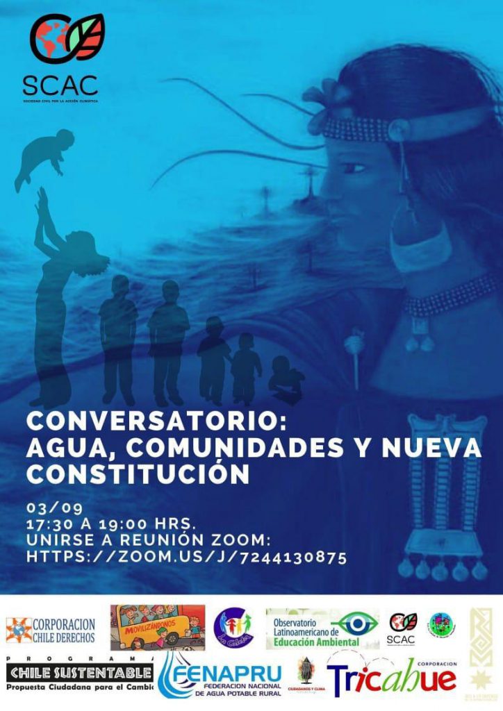 Hoy miércoles 3 de septiembre de 2020 a las 17:30, la presidencia de FENAPRU participará en un conversatorio clave para los próximos meses en el país. El conservatorio es organizado por la Comisión de Educación de la Sociedad Civil por la Accion Climática (SCAC) y se titula “Agua, comunidades y nueva constitución”, y además de FENAPRU, participará ChileSustentable y la Red de Infancia Mapuche.