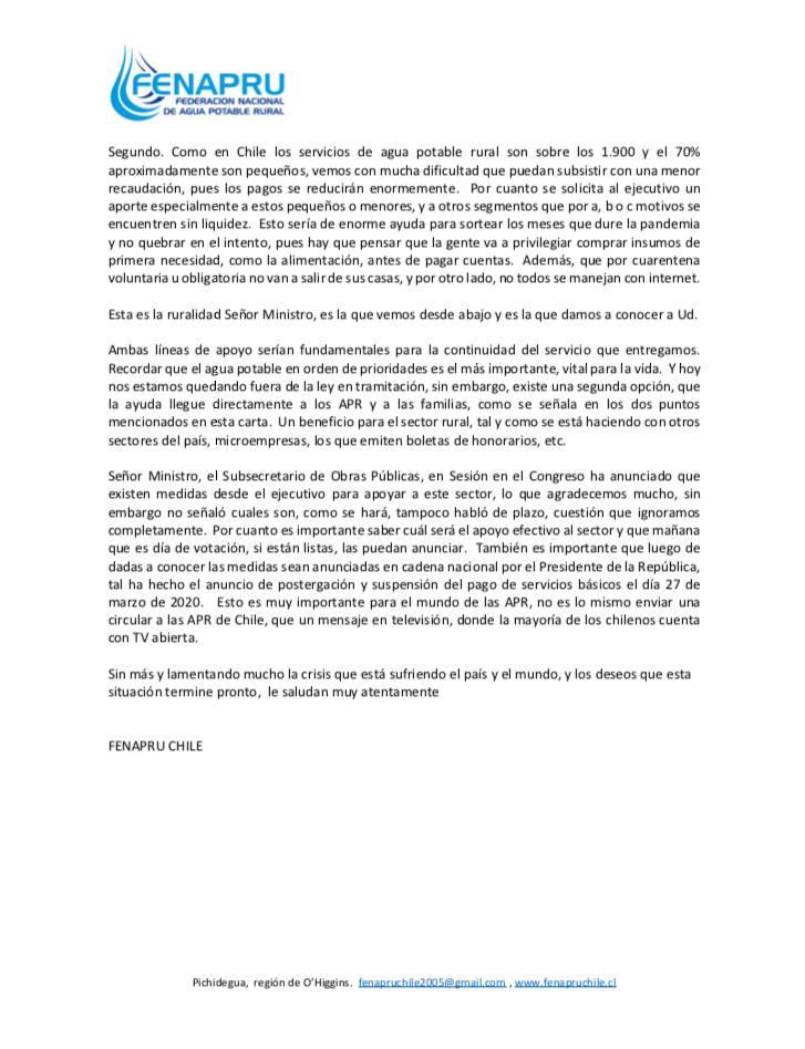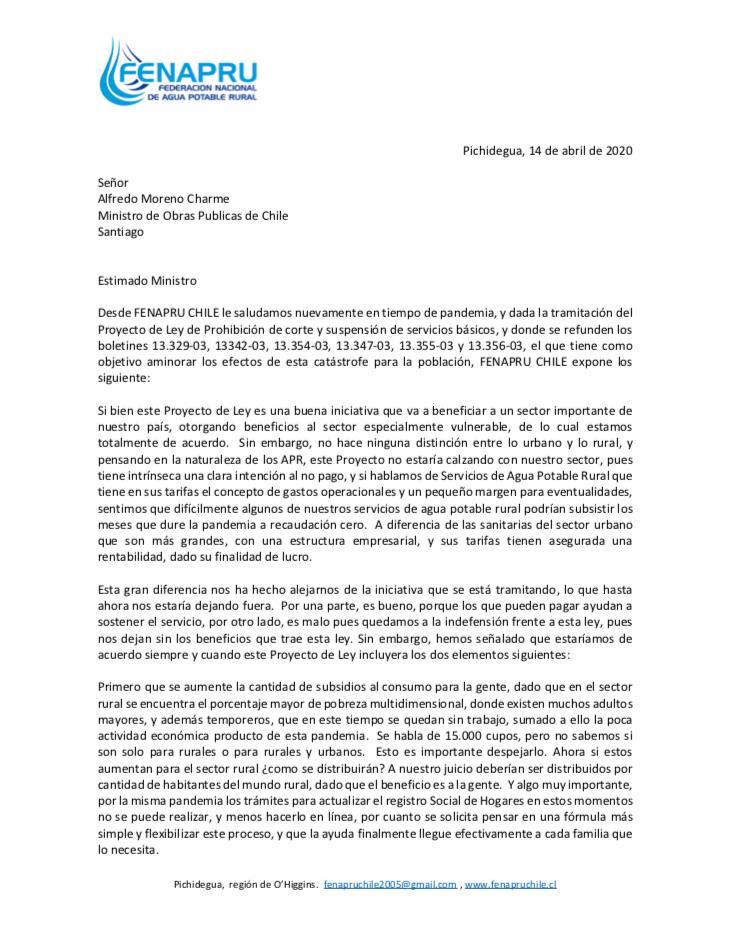 Es importante mencionar que, desde marzo, FENAPRU estuvo abogando por este beneficio, con cartas al Ministro de Obras Públicas, con llamados, con conversaciones con parlamentarios, junto a ello hubo otras organizaciones que abogaron por lo mismo, y conseguimos el Bono que se dará a todos los APR de Chile, por tres meses, y el que servirá para sortear meses de baja recaudación producto del COVID-19.  Más abajo pueden encontrar una de las cartas que se envió en su momento al Ministro de Obras Públicas.