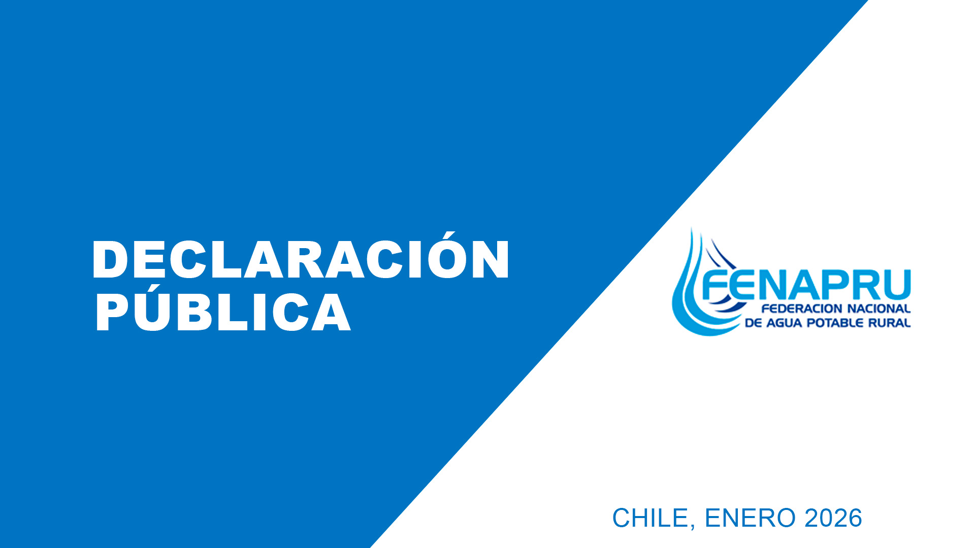 Sobre el modelo de Agua Potable Rural y el escenario político actual.La Federación Nacional de Asociaciones Gremiales Regionales y Provinciales de Agua Potable Rural de Chile, FENAPRU CHILE, organización que representa a miles de dirigentes y comunidades rurales a lo largo del país, declara a la opinión pública lo siguiente: El Agua Potable Rural en